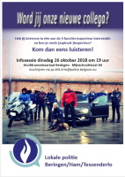 De politiezone Beringen/Ham/Tessenderlo heeft 4 plaatsen van inspecteur interventie vacant staan in de mobiliteitscyclus 2018-04. Op dinsdag 16 oktober 2018 om 19 uur organiseren we een infosessie om de functies toe te lichten op het hoofdcommissariaat in Beringen (Mijnschoolstraat 84). Inschrijven voor deze infosessie kan via pz.bht.hrm@police.belgium.eu.